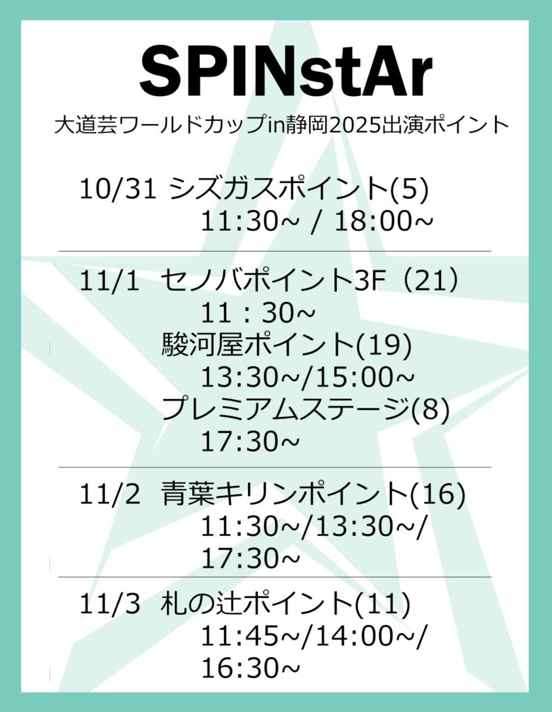 SPIN stArのスケジュールは画像でご確認ください。場所や時間によって中身が変わるのでどの時間もお見逃しなく!みんなで応援しに来てくださーーーーーい☆