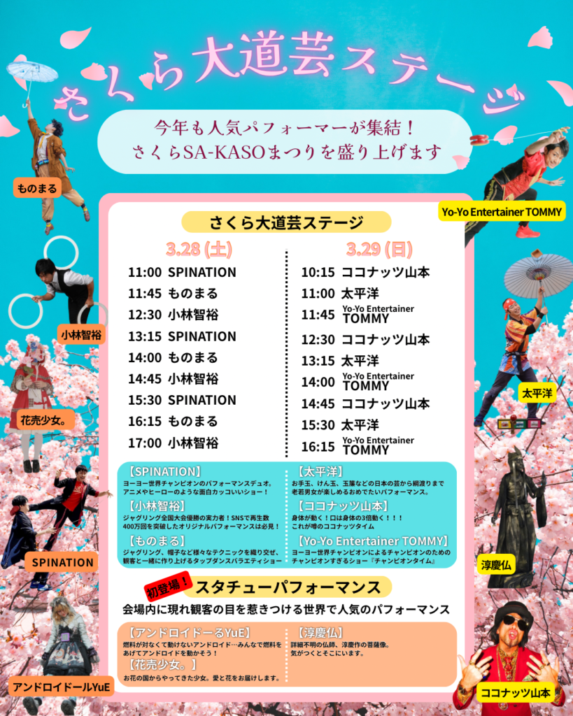 今年もさくらまつりの大道芸エリアを担当させていただきます。会場をパフォーマンスで盛り上げていきたいと思います!!!